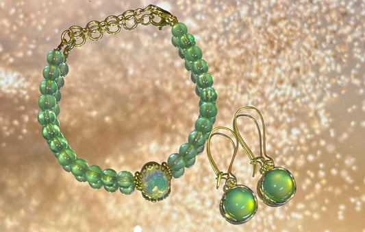 Opal‑Glow Bead Bracelet + Earrings Set (Gold‑tone)
