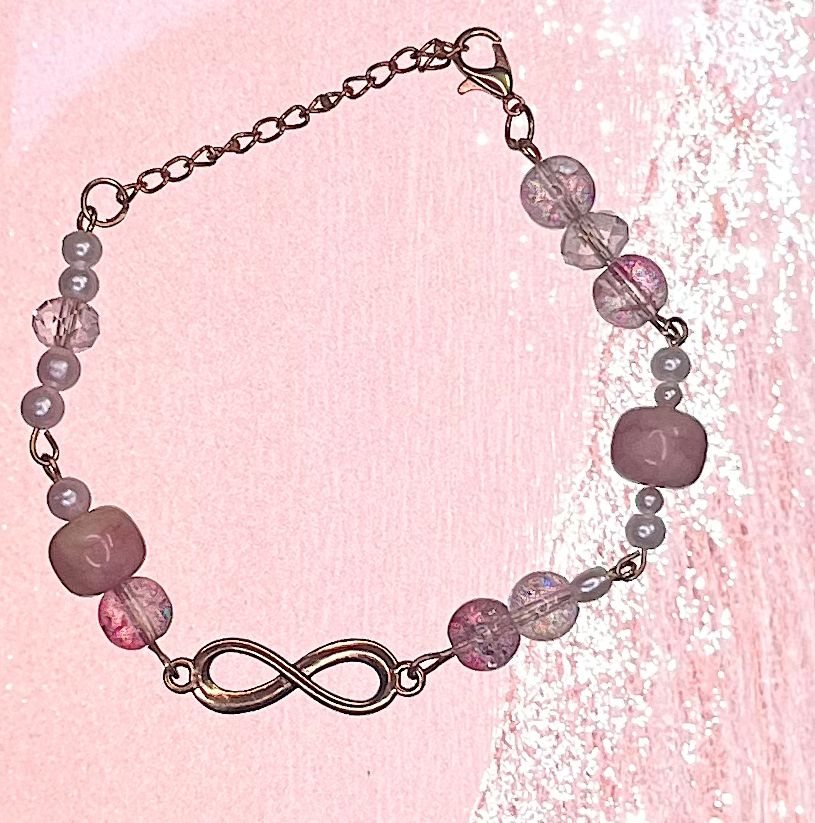 Delicate bracelet featuring a gold‑tone infinity symbol, blush pink and clear crackle beads, petite faux pearls, and a lobster clasp with chain extender. Lightweight sparkle you can stack or wear solo.